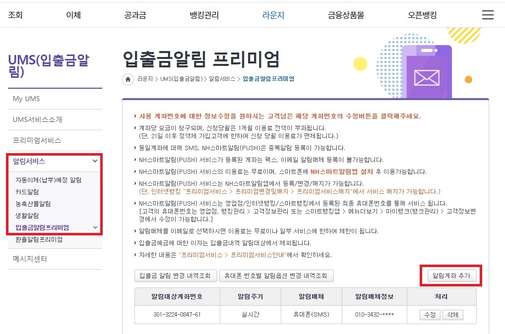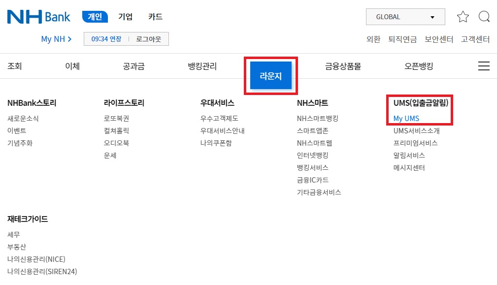 ¶ó¿îÁö > UMS(ÀÔÃâ±Ý¾Ë¸²) My UMS ¼ºñ½º¸¦ Ŭ¸¯ÇÕ´Ï´Ù